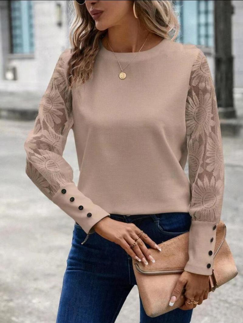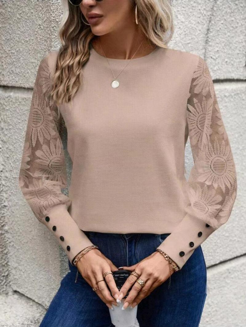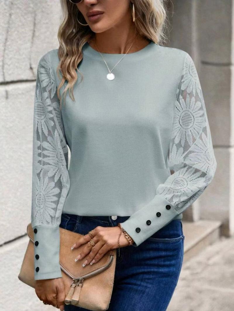 Huonwei Women Waffle Tops Long Sleeve Casual T Shirt Mesh Floral Blouse Crew Neck Loose Pullover Button Decor Tee Women'S Shirt for Christmas Halloween Party New Year Gift 118